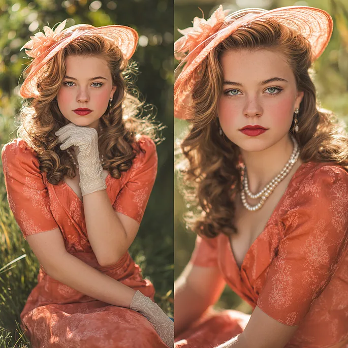 For the 1940s and 1950s look, think pin curls or a structured wave, a fit-and-flare silhouette, and classic pumps. The poses should feel composed and deliberate — less casual movement, more presence. Studio lighting with a clean, slightly warm background reads beautifully in this aesthetic. Black-and-white processing can look stunning, or you can stay in color with a slightly desaturated, film-like treatment.